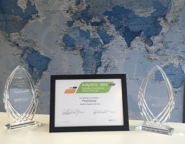 At the official recognition event at Kelly Service’s global headquarters in Michigan, Proclinical were named as leading suppliers in the EMEA category for 2015, adding to their 2014 award. This is the fourth consecutive year that KellyOCG has honoured suppliers who are members of the Company’s preferred supplier network.